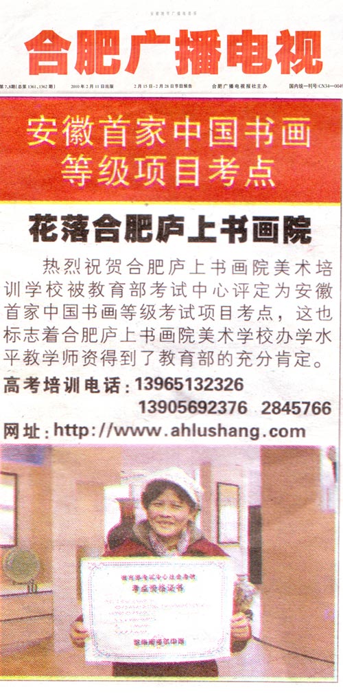 熱烈祝賀合肥廬上書(shū)畫(huà)院美術(shù)培訓學(xué)校被教育部考試中心批準為全國書(shū)畫(huà)考級單位