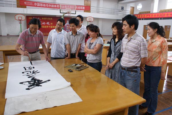捐贈儀式結束后著(zhù)名畫(huà)家魏興無(wú)又受邀現場(chǎng)親筆揮毫示范,引得滿(mǎn)堂喝彩,把正在進(jìn)行的全縣中小學(xué)美術(shù)教師基本功大賽推向了高潮。