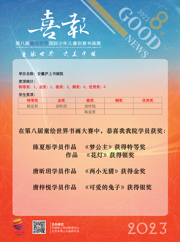 喜報—恭喜我院學(xué)員在第八屆"童繪世界"國際少年兒童創(chuàng )意書(shū)畫(huà)展中取得優(yōu)異成績(jì)