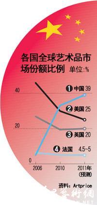 《朝鮮日報》認為,世界藝術(shù)市場(chǎng)已被中國占領(lǐng)。2006年中國在世界藝術(shù)品拍賣(mài)市場(chǎng)上的占有率僅列第四位(4.9%),但2010年已躍升至第一位(33%),2011年(39%)繼續蟬聯(lián)第一寶座,并進(jìn)一步拉大與第二位美國之間的距離。