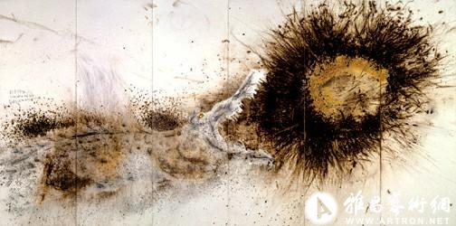 蔡國強最初開(kāi)始做火藥畫(huà)的時(shí)候,受到了奶奶滅火的啟發(fā)――滅火就是控制燃燒的效果,就像繪畫(huà)需要控制顏料在畫(huà)布上的分寸。創(chuàng )作于1985年的《自畫(huà)像》是蔡國強最早的火藥畫(huà)之一,他在自己創(chuàng )作的油畫(huà)上爆破,火藥在站立的人形上留下了放射型的燒灼痕跡。