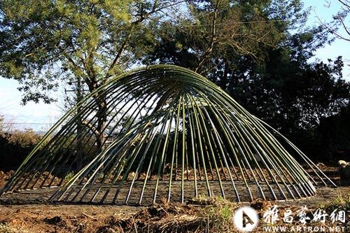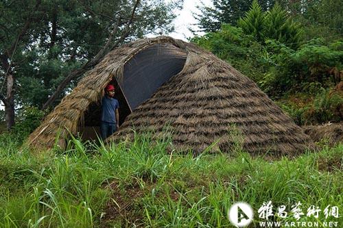 同樣采用竹子作為材料卻表現得更加簡(jiǎn)潔和原始的建筑來(lái)自伊朗。這種臨時(shí)的避難所運用最便宜也最常見(jiàn)的材料建造。不同的竹條被彎曲重疊,直到其成為一個(gè)層疊的圓形。在這個(gè)粗糙的穹頂之下,可以是高度不同的空間。而在竹條之外則覆蓋了一層稻草,這些植物的莖稈可以讓空氣流入卻把雨水擋在外面。
