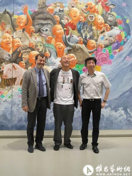 GAM都靈市立現當代美術(shù)館館長(cháng)達尼洛•?藸枺ㄗ笠唬、藝術(shù)家方力鈞(中)、中國美術(shù)館館長(cháng)范迪安(右一)在展覽現場(chǎng)