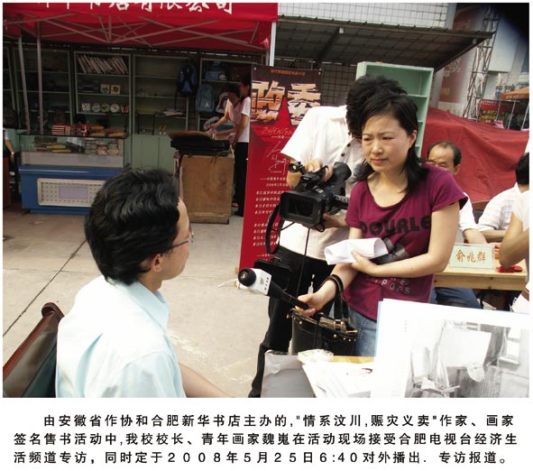 北京魏嵬藝術(shù)基地校長(cháng)、合肥廬上書(shū)畫(huà)院美術(shù)學(xué)校長(cháng)、知名青年畫(huà)家魏嵬受邀參加這次義賣(mài)活動(dòng)。魏嵬作為這次活動(dòng)唯一接受邀請的畫(huà)家受到媒體的廣泛關(guān)注。安徽衛視、經(jīng)濟生活頻道第一時(shí)間、合肥電視臺經(jīng)濟生活頻道均在5月25日晚上6:30播出專(zhuān)訪(fǎng)。同時(shí)這次藝賣(mài)活動(dòng)中,魏嵬把著(zhù)述的中央美院考前沖刺作業(yè),全套4冊,計50套美術(shù)高考教學(xué)用書(shū)所售款全部捐獻給四川災區。