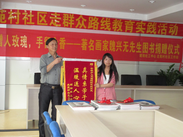 由合肥市蜀山區宣傳部發(fā)起的獻愛(ài)心名家走基層。著(zhù)名畫(huà)家魏興無(wú)“捐贈圖書(shū)活動(dòng)”,目前在合肥市琥珀街道北苑村社居委舉行。本次活動(dòng)的圖書(shū)由青年畫(huà)家魏嵬提供。他所著(zhù)述的中央美院教科書(shū)系列計260本?們r(jià)為10400元。以充實(shí)和豐富社區工作站圖書(shū)室里的圖書(shū)內容,為社區里的中小學(xué)愛(ài)好美術(shù)的學(xué)子提供一道優(yōu)質(zhì)的美術(shù)教育輔導。