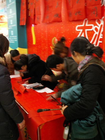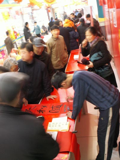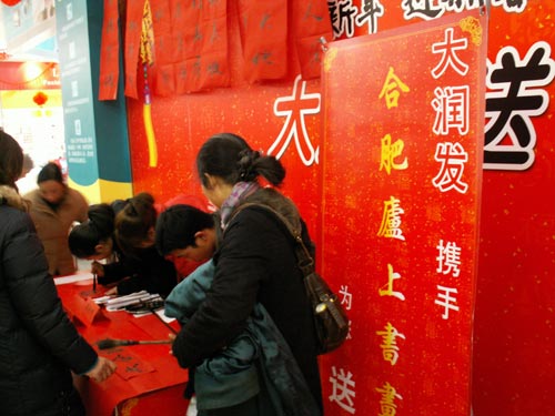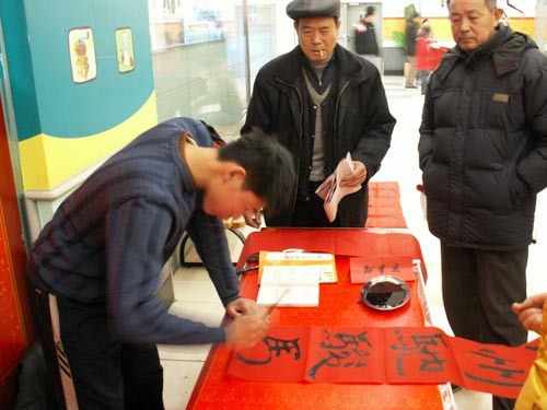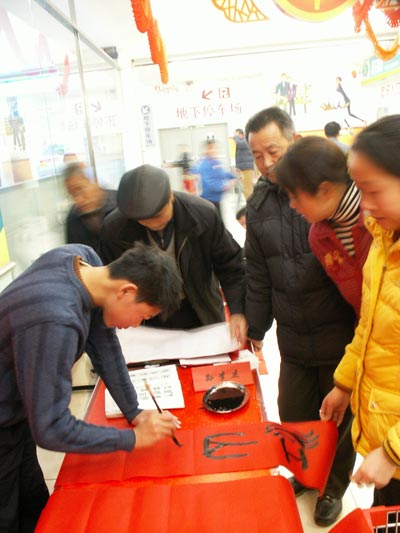 由琥珀山莊街道聯(lián)手大潤發(fā)超市和合肥廬上書(shū)畫(huà)美術(shù)培訓學(xué)校共同主辦的為社區群眾免費送春聯(lián)活動(dòng),元月22日上午10點(diǎn)準時(shí)舉行。四名義務(wù)寫(xiě)春聯(lián)學(xué)生均系廬上書(shū)畫(huà)院學(xué)員,均系全國書(shū)畫(huà)大賽特別金獎的選手。我省著(zhù)名書(shū)畫(huà)家、廬上書(shū)畫(huà)院院長(cháng)魏興無(wú)也親臨現場(chǎng)為廣大社區群眾寫(xiě)春聯(lián)。一位老年大學(xué),書(shū)法專(zhuān)業(yè)學(xué)員,退休老干部對魏興無(wú)院長(cháng)說(shuō):“我早就看準了你的字,寫(xiě)得真好,我還要叫我的孫子到貴校學(xué)習書(shū)法”。